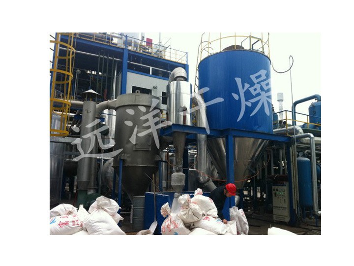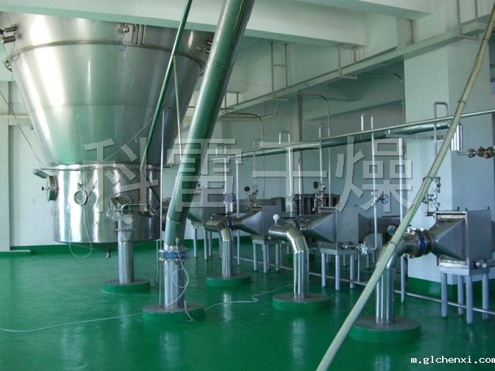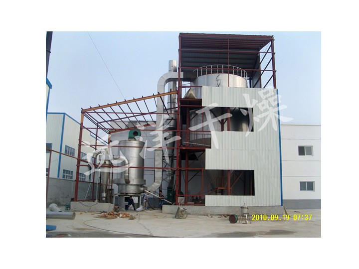 该生产线由供料系统、介质循环系统、空气加热净化系统、干燥塔系统、收料系统、控制系统等多个系统整合而成。主塔系统集中了目前喷雾干燥工程的所有尖端技术,喷干机组的收料系统由一级旋风分离器+布袋除尘器组合形成。一级旋风采用高气量高效率旋风进行收集,其收粉率能达到96%左右分,而布袋除尘器是针对蛋白粉类除尘专门设计的优化设备,能使物料与风进行完全分离并沉降,布袋为拒水防油防静电布袋,过滤目数可达500目以上。