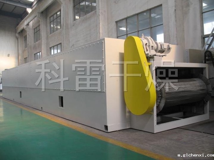 整个生产线为全封闭型(对物料而言),由摆动布料段、干燥段、出料段三部分组成。摆动布料段作用使海藻均匀分散在网板上,并且匀速输送到干燥段,海藻经过80℃热风干燥段,90℃热风干燥段和120℃热风干燥段后,再经过出料段排料。循环风向及各单元内风的循环为向下式,即加热后的空气由引风机吸入,在风机出风口首先预分布再经过孔板均风后,热风从物料的下面向上(或从物料的上面向下)穿透物料层。