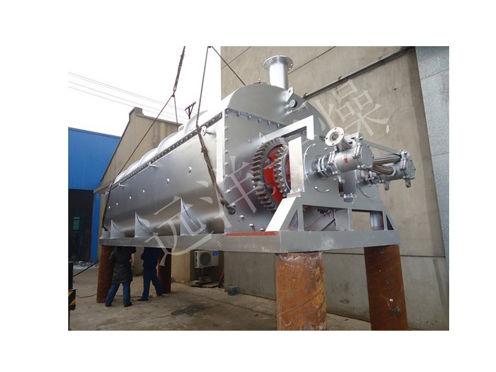 空心轴上密集排列着楔型中空桨叶,热介质经空心轴流经桨叶。单位有效容积内传热面积很大,热介质温度从-40℃到320℃,可以是水蒸汽,也可以是液体型:如热水、导热油等。间接传导加热,没有携带空气带走热量,热量均用来加热物料。热量损失仅为通过器体保温层向环境的散热。楔型 桨叶传热面具有自清洁功能。物料颗粒与楔型面的相对运动产生洗刷作用,能够洗刷掉楔型面上附着物料,使运转中一直保持着清洁的传热面。桨叶干燥机的壳体为W型,壳体内一般安排二到四根空心搅拌轴。壳体有密封端盖与上盖,防止物料粉尘外泄及收集物料溶剂蒸汽。出料口处设置一挡扳,保证料位高度,使传热面被物料覆盖而充分发挥作用。热介质通过旋转接头,流经壳体夹套及空心搅拌轴,空心搅拌轴依据热介质的类型而具有不同的内部结构,以保证^佳的传热效果。